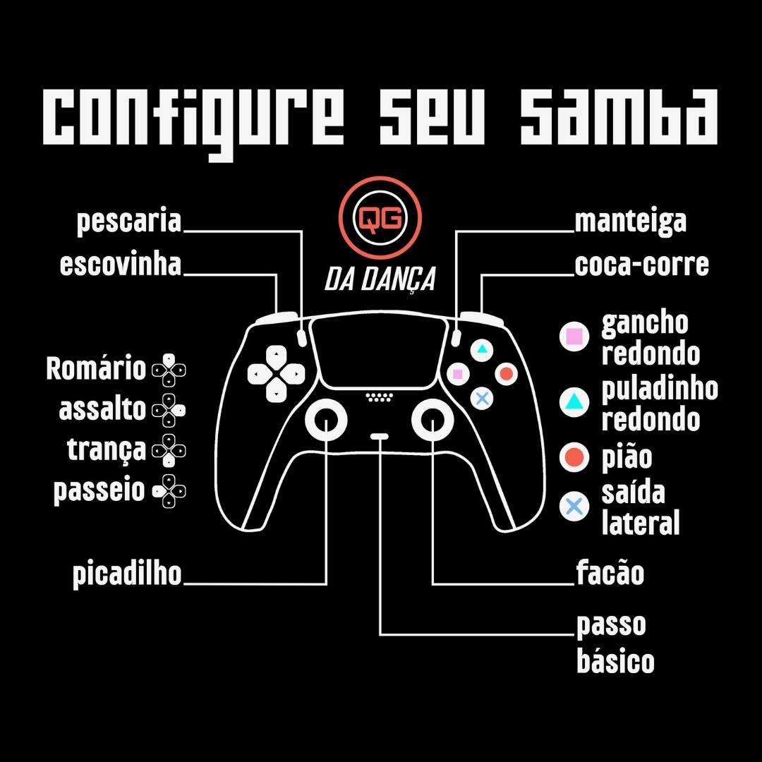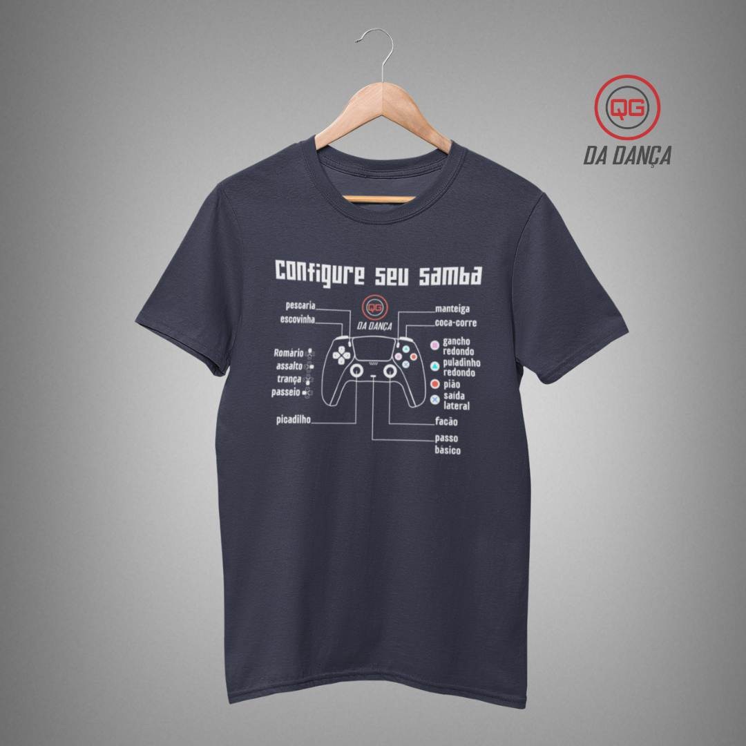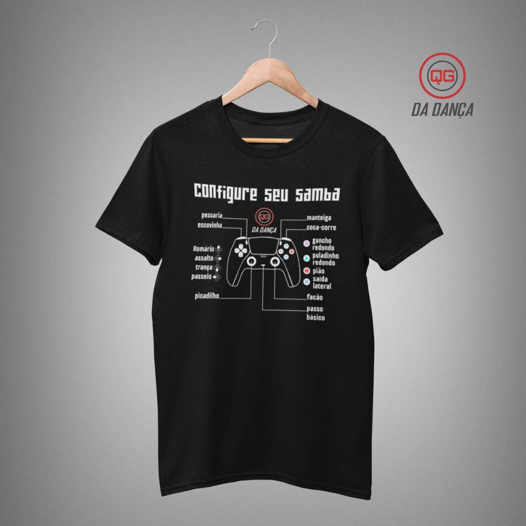 Camiseta de dança perfeita para quem vive o samba com criatividade, ritmo e muita personalidade. Com a estampa divertida “Configure seu samba”, inspirada no universo dos videogames, a peça transforma os passos clássicos do samba em comandos de um controle. Movimentos como gancho, redondo, puladinho, pião e saída lateral aparecem de forma criativa, mostrando que dominar o samba é quase como dominar um jogo cheio de níveis e desafios.