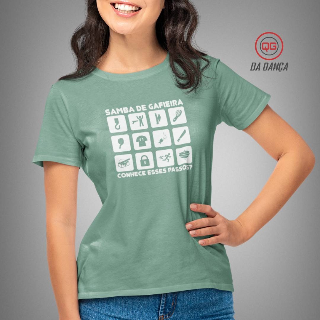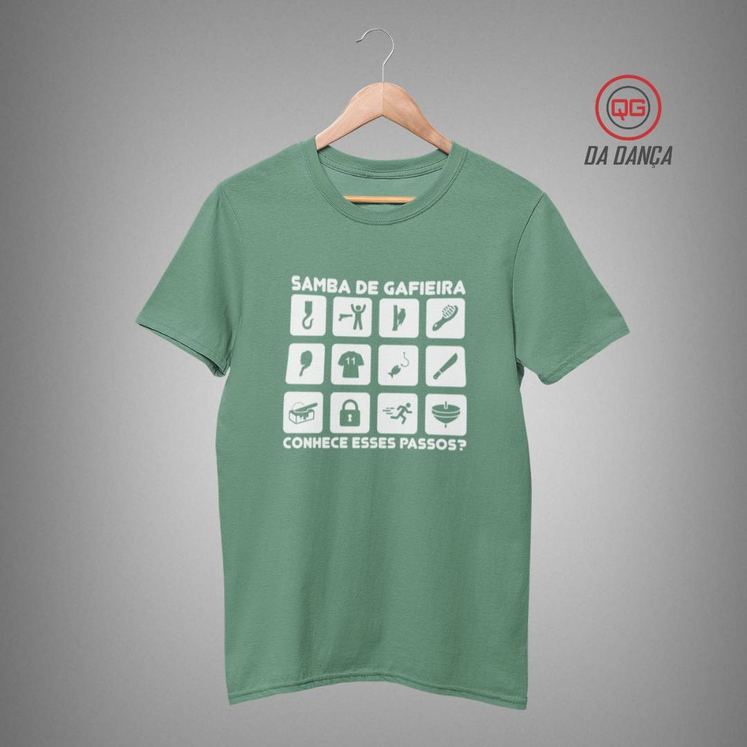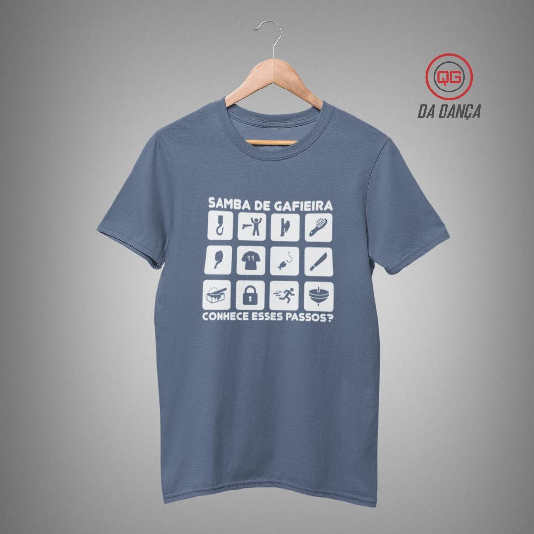 Camiseta de samba perfeita para quem vive o ritmo do samba de gafieira e domina cada passo no salão. Com a estampa criativa “Samba de Gafieira – Conhece esses passos?”, a peça traz ícones que representam movimentos e elementos marcantes desse estilo envolvente. É ideal para dançarinos que se identificam com a técnica, a elegância e a malandragem presentes na dança a dois.