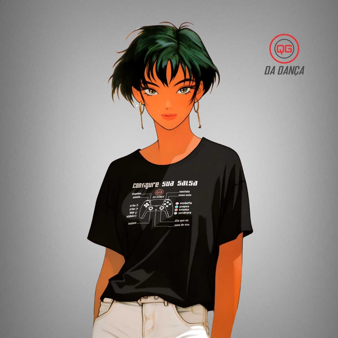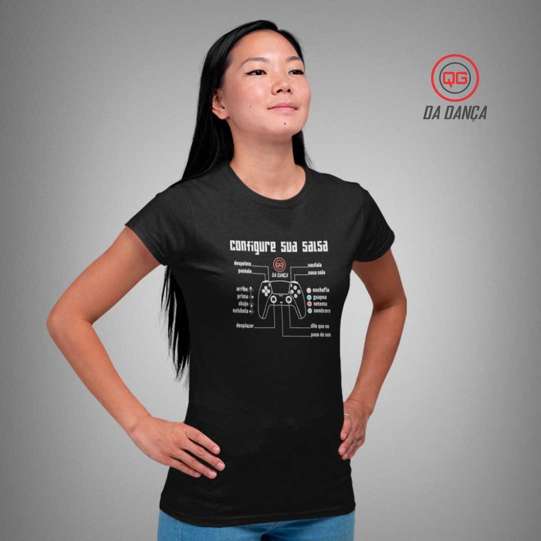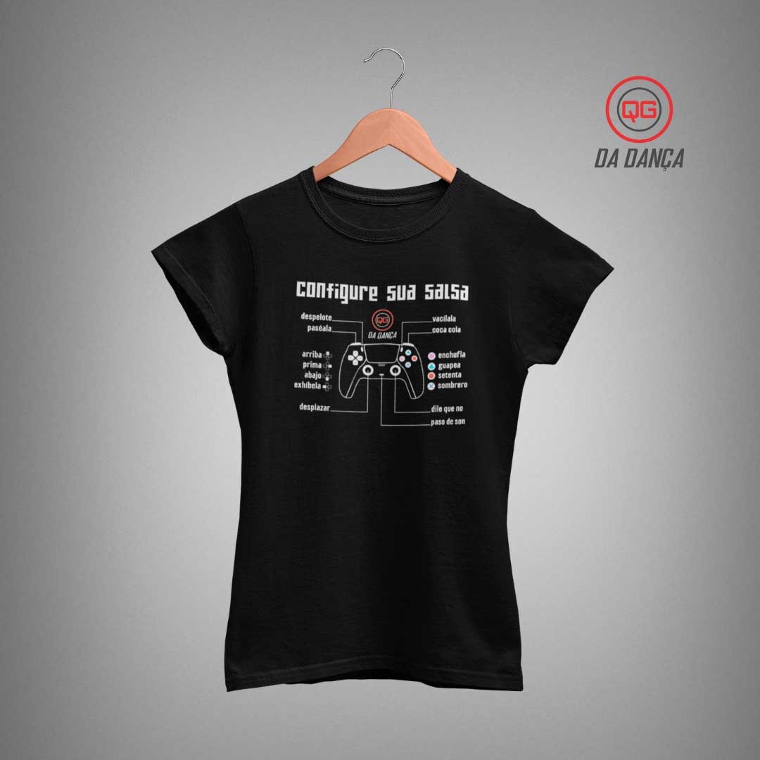 Para os apaixonados por dança e games! Nossa camiseta "Configure sua salsa" traz uma estampa criativa e cheia de personalidade: uma manete de videogame, onde os botões estão configurando os passos de dança. Como se cada movimento fosse parte de um jogo onde você é o protagonista!