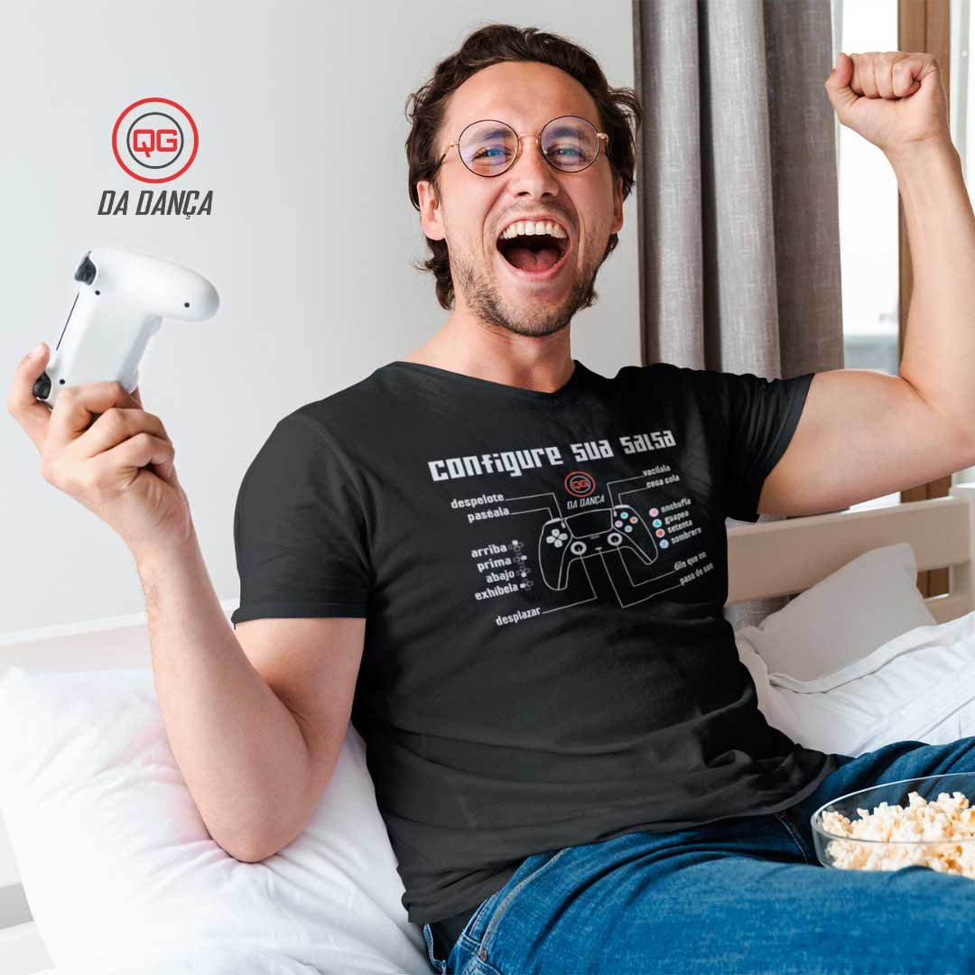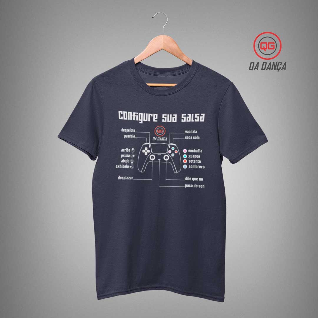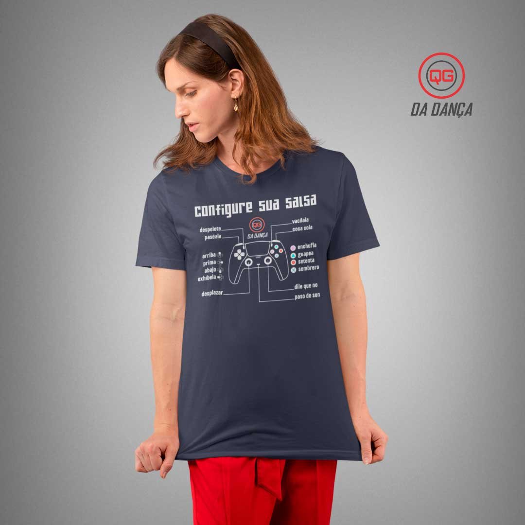 Para os apaixonados por dança e games! Nossa camiseta "Configure sua salsa" traz uma estampa criativa e cheia de personalidade: uma manete de videogame, onde os botões estão configurando os passos de dança. Como se cada movimento fosse parte de um jogo onde você é o protagonista!